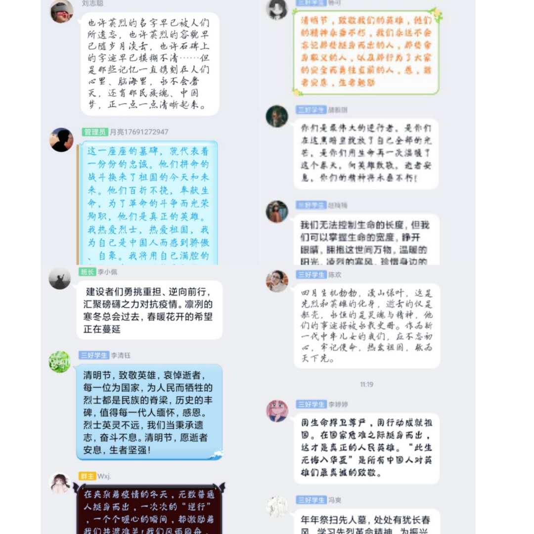 此外,各班团支部利用QQ群、微信群等平台开展了线上支部活动,用网络签名寄语的方式,倡导学生居家开展“云端祭英烈”活动。通过线上集中观看爱国主义影片、诵读经典诗歌、主题网络作品等多种形式,深入学习领会英烈的先进事迹和崇高精神,不断增强民族自豪感和担当意识。