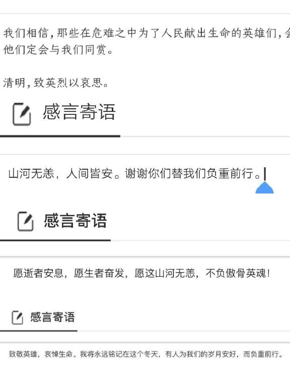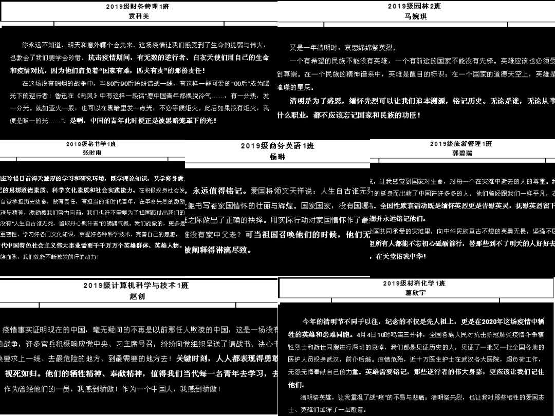 各二级学院团总支组织学生通过手机、电脑登录中华英烈网进入“致敬·2020清明祭英烈”专题板块,开展网上祭英烈活动,学生通过学习英烈事迹、书写寄语、评论留言等多种形式寄托哀思,以绿色、文明、简约的祭扫新风表达对先辈、对英烈、对抗疫中牺牲英雄的怀念、感恩与敬仰。