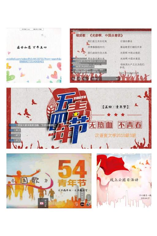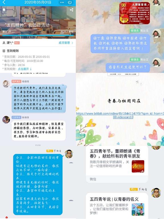 创新团组织生活,积极开展“五四”主题云团日活动。在“五四”期间,我校各二级学院团总支结合实际,组织班团支部集中开展特别主题云团日活动,通过唱国歌、微团课、学习典型、重温入团誓词、唱团歌等,将传承五四精神与弘扬新时代爱国主义精神相结合,强化仪式感召。