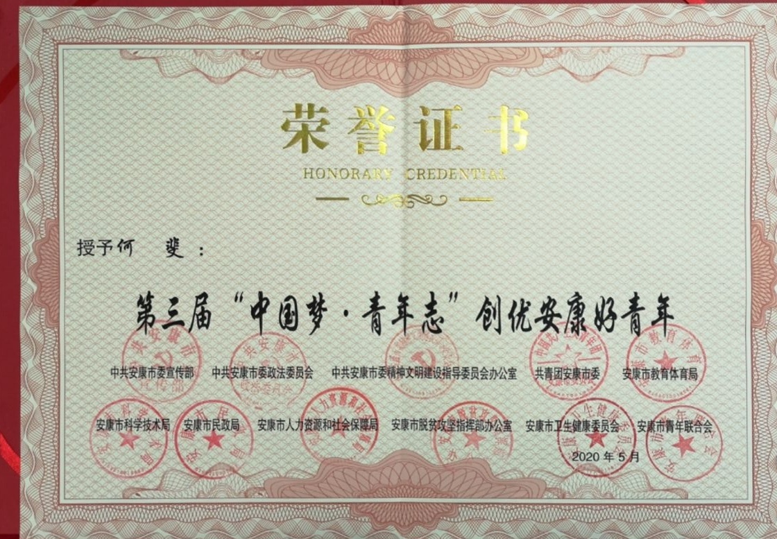 近日,安康市第三届“‘中国梦·青年志’—寻找身边的安康好青年”评选活动揭晓,我校青年教师何斐博士被评为第三届“中国梦·青年志”创优安康好青年。