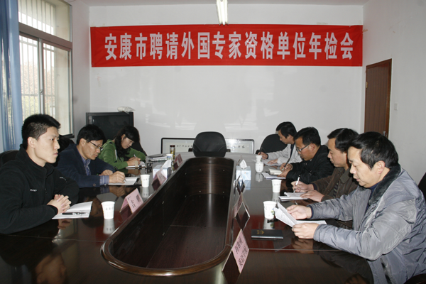 参加年检的资格单位有汉滨区培新小学、兴科竹园双语幼儿园、安康汉滨区阿斯顿英语学校、安康学院。我院外事办主任陈立强代表学院对我院一年来聘请外国文教专家的情况进行了全面细致的汇报。省外办吉明同志就明年办理签证通知书的新要求进行了讲解。外专局张洁同志就聘请外国文教专家的材料准备、资格审查、外教兼职等政策性很强的内容进行了详细解释。