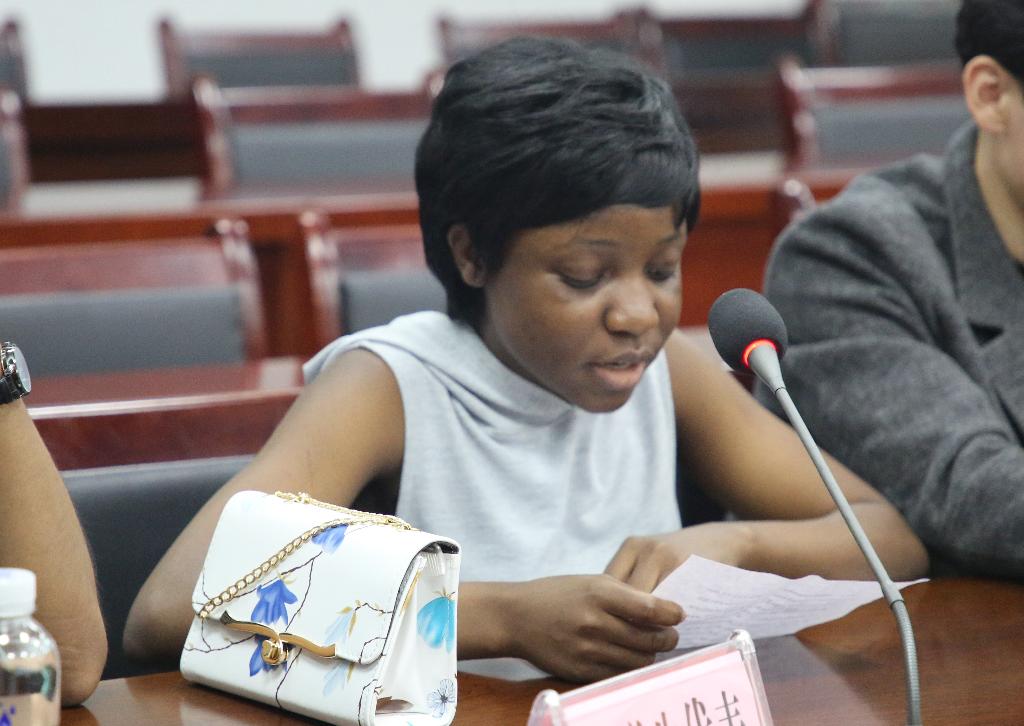 我校来华留学生兰静(加纳籍)、赵强(乌兹别克斯坦籍)代表国际教育学院全体来华留学生发言,表达了自己在安学习的感受,对新冠疫情期间中国的快速应对和对其他国家进行医疗援助表示敬佩,对学校在疫情防控期间对来华留学生的人文关怀和无私帮助表达了感谢。