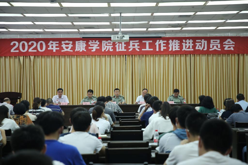 6月15日下午,我校2020年大学生应征入伍工作推进动员会在图书馆六楼报告厅召开。安康市征兵办公室主任、安康军分区副司令员武德鹏,安康市征兵办公室副主任、安康军分区动员处处长马福学,汉滨区人武部部长孟高峰,我校党委副书记杨行玉,招就处、宣传部、校武装部及二级学院党总支书记、副书记、辅导员、学生代表等200余人参加。会议由杨行玉主持。