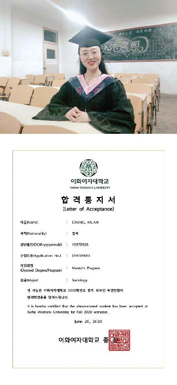 成欢于2018年2月参加我校与韩国庆星大学交换生项目,赴韩学习交流一学期,2018年8月参加我校与英国博尔顿大学暑期游学项目,2020年1月赴韩国参加语言水平测试,获韩语TOPIK 4级水平,并通过梨花女子大学专业面试,最终成功获得硕士研究生项目入学通知书,展现了我校学子扎实优秀的综合素养与踏实上进的良好风貌。