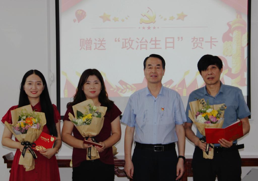 随后,文传学院党总支书记芦伟宣读庆祝“政治生日”党员名单,阐明党总支开展党员“政治生日”主题活动以强化党员身份意识和责任意识,激励党员不忘初心、牢记使命的目的,并向过“政治生日”的5位党员教师致以诚挚祝福。学校党委书记王国良、文传学院院长杨运庚、文传学院党总支书记芦伟分别为过“政治生日”的党员教师赠送贺卡和鲜花。