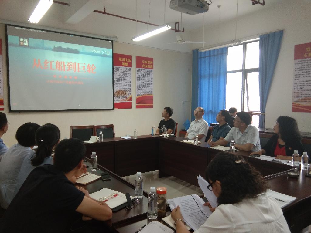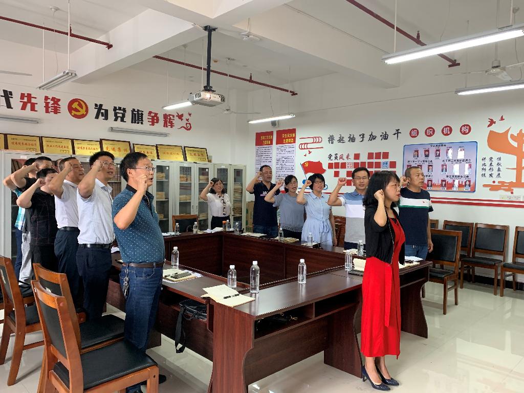全体党员佩戴党徽,在高亢激昂的旋律中奏唱国歌。在庄严的党旗前,全体党员郑重地举起右手,重温了入党誓词。随后,与会同志一起观看学习强国平台视频《从红船到巨轮》。