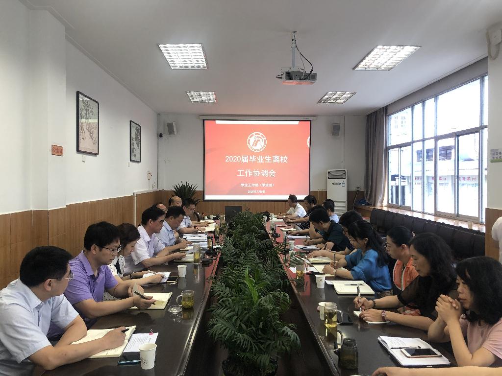 7月6日上午,2020届毕业生离校工作协调会在江南校区第一会议室召开。学校党委副书记杨行玉、副校长钟生海,相关职能部门负责人以及各二级学院党总支书记参加会议。会议由钟生海主持。