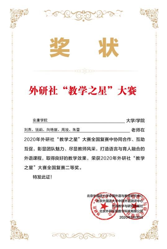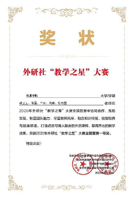 近日,2020年外研社“教学之星”大赛全国复赛成绩揭晓,我校外语学院推荐的两个教学团队在全国400多所高校的激烈竞争中脱颖而出:由副院长胡卫卫作为团队负责人的专业教师教学团队(成员:陈蕾、王欢、冯琳、彭方圆)获得了英语专业组本科组一等奖,刘燕副教授作为团队负责人的大学英语教师教学团队(成员:钱莉、向艳丽、周玫、朱蕾)获得了大学英语组二等奖的好成绩。