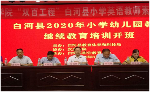 8月1日上午,安康学院 “双百工程”暨白河县小学幼儿园教师继续教育培训开班仪式在白河县职教中心举行。活动由白河县教体与科技局副局长秦学梅主持,白河县教体与科技局局长王西京、白河县职教中心校长蔡乾明、白河县职教中心副校长胡晓伟、安康学院外语学院副院长张哲华等出席开班仪式。白河县小学、幼儿园的英语及体音美教师参加了开班仪式。