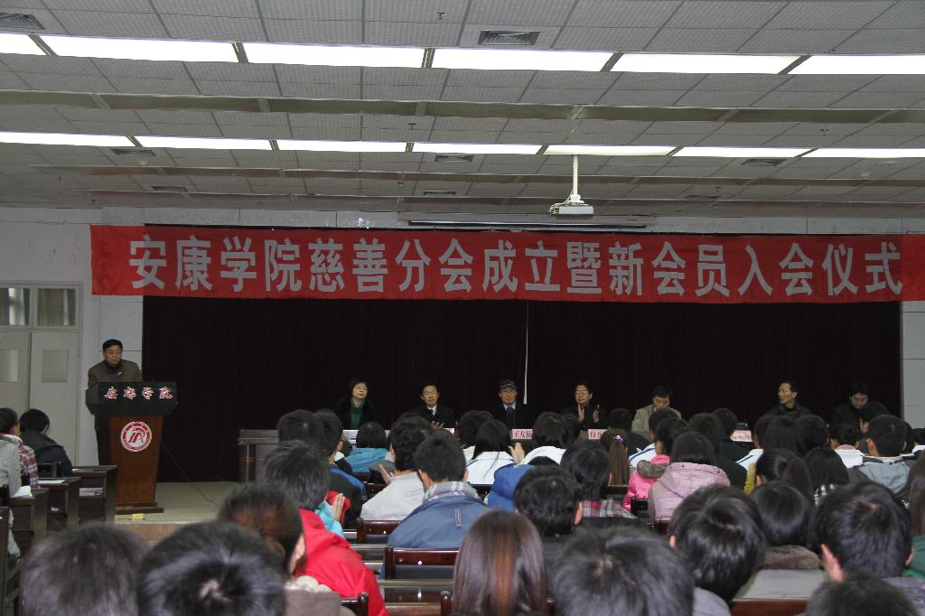 2010年12月23日下午4点30分,安康学院慈善分会成立暨新会员入会仪式在学院图书馆六楼报告厅隆重举行。安康市慈善协会会长段吾勇、副会长吉东明、王友根、社会宣传部部长柳华丽、安康学院党委副书记胡鸿晓、学生工作部、团委、化学化工系负责人、各院系团总支书记及部分慈善志愿者代表参加了仪式。仪式由段吾勇主持。