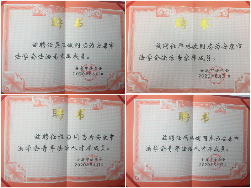经安康市法学会审查、网上公示、会长会议研究,我校马克思主义学院吴亚娥、单林波获聘为安康市法学会法治专家库成员;冯炜娟、程颖获聘为安康市法学会青年法治人才库成员。