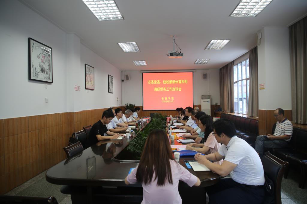 9月16日,市委常委、统战部部长雷西明带领市侨联党组书记凌寿斌、市委统战部副部长周益能等一行6人到我校调研指导统战工作。校党委书记王国良、党委副书记胡波陪同调研。“留联会”“知联会”负责人,留学归国人员代表及侨眷代表参加了调研座谈会。