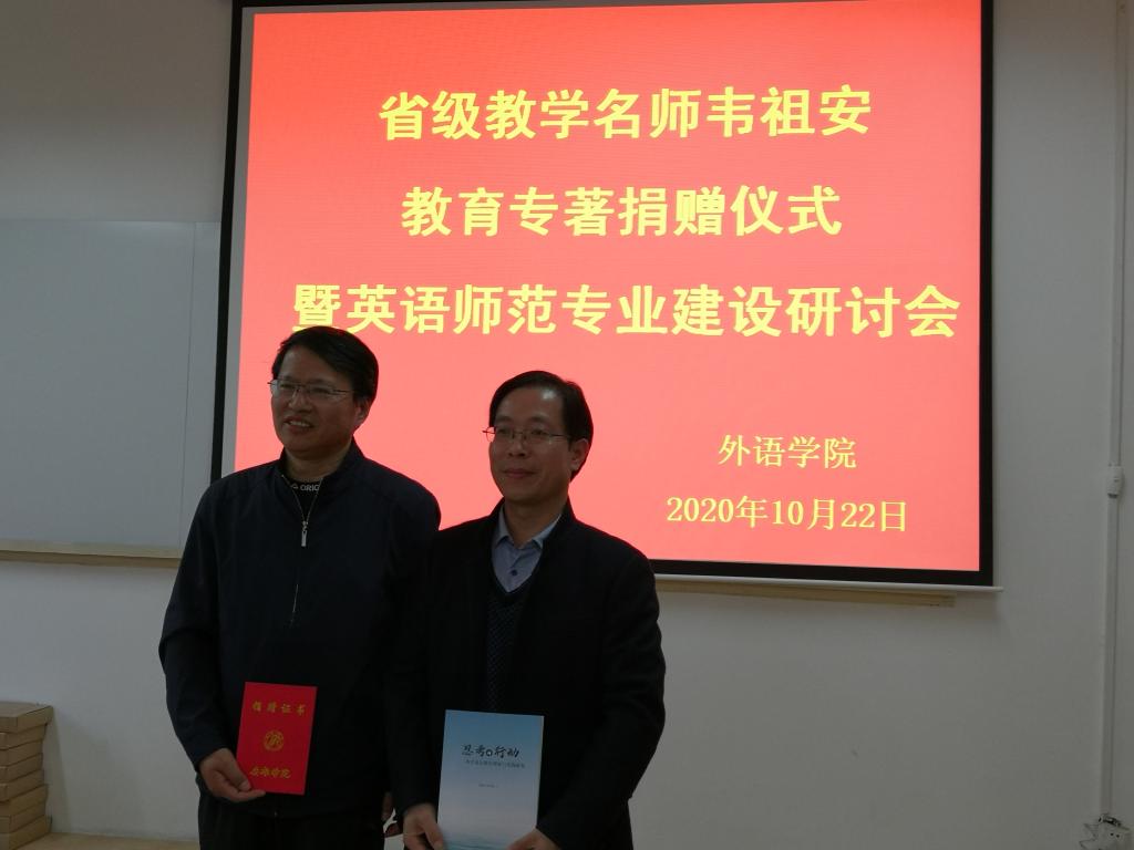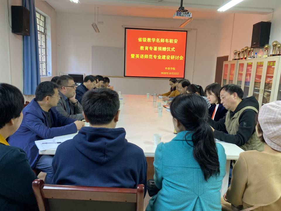 10月22日,汉滨高中原副校长、省级中小学教学名师韦祖安教育专著捐赠仪式暨英语师范专业建设研讨会在我校举行。韦祖安教学团队、我校外语学院党政领导班子及教师教育教学团队全体成员参加了会议。