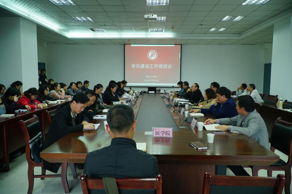 10月30日下午,我校学风建设工作推进会在江北校区逸夫科技楼九楼会议室召开。党委副书记杨行玉出席会议并作总结讲话。宣传部、学工部、团委、教务处等职能部门负责人、各学院党总支书记、分管学生工作副书记以及全体辅导员参加了会议。会议由学生工作部副部长黄娟主持。
