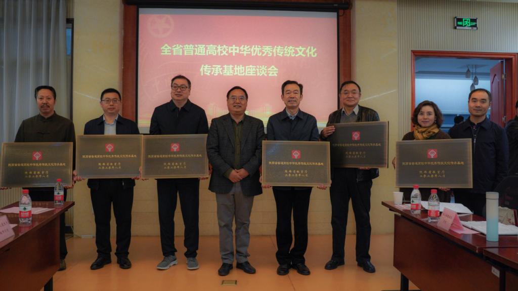 座谈会上,刘宝平为19所高校中华优秀传统文化传承基地授牌,余谦代表学校接受“陕西省普通高校中华优秀传统文化传承基地”授牌。