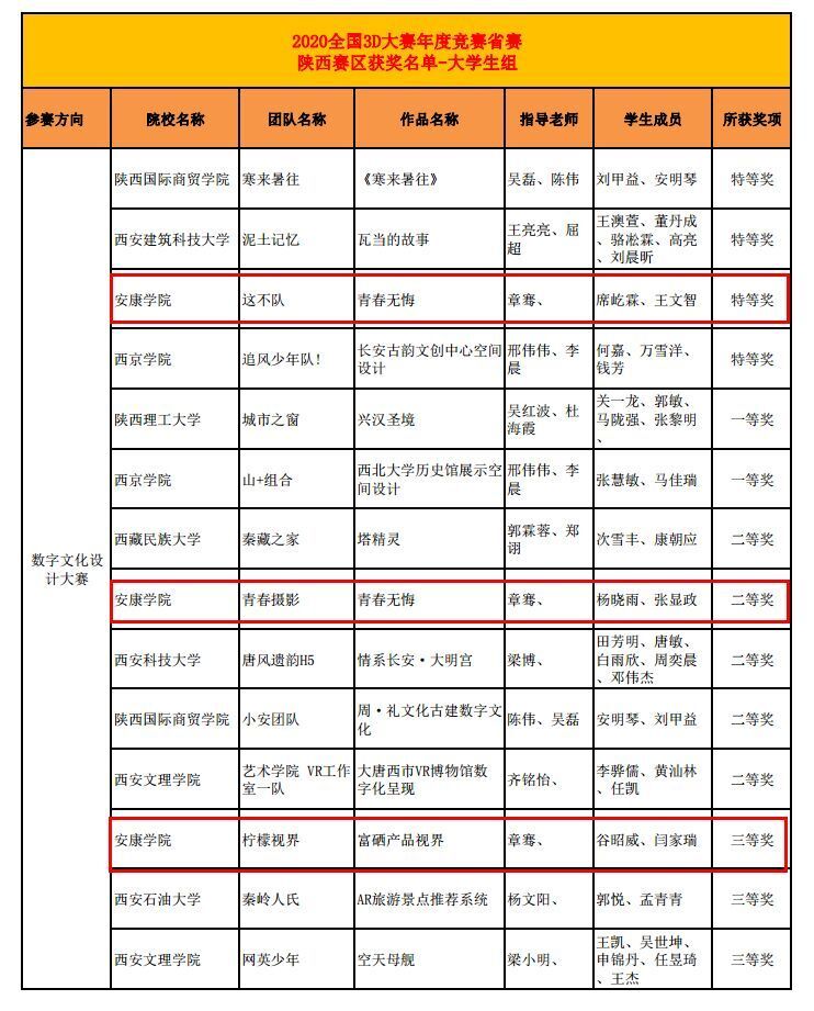 11月5日,第十三届全国三维数字化创新设计大赛省赛作品评审结果揭晓,我校学子喜获佳绩,艺术学院学生获得陕西省赛区数字文化设计类特等奖1项,二等奖1项,三等奖1项,有1部作品被推荐参加国赛。