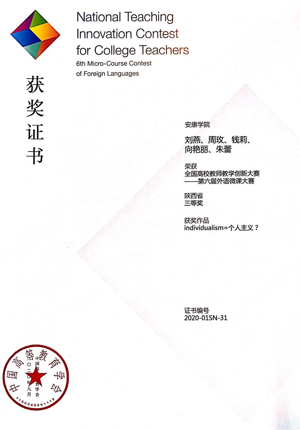 刘燕、周玫、钱莉、向艳丽、朱蕾 团队荣获三等奖 |