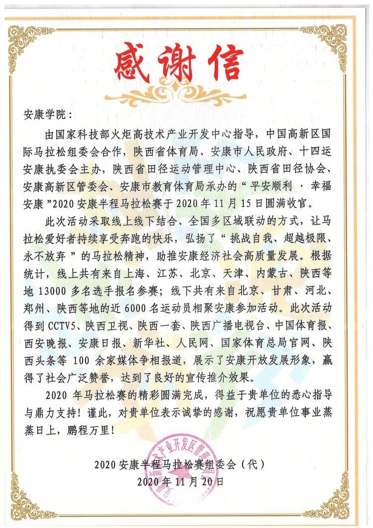 “2020年马拉松赛的精彩圆满完成,得益于贵单位的悉心指导与鼎力支持!谨此,对贵单位表示诚挚的感谢,祝愿贵单位事业蒸蒸日上,鹏程万里!”11月24日,我校收到了2020安康半程马拉松赛组委会的感谢信。