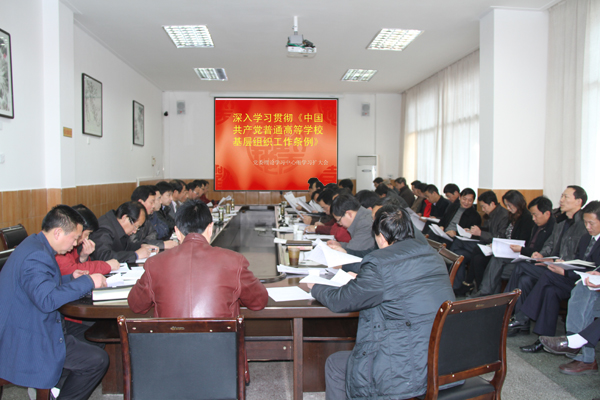 党委书记杨涛介绍了2月14日由省委组织部、省委教育工委共同举办的全省高校学习贯彻《中国共产党普通高等学校基层组织工作条例》培训班学习的情况,传达了培训学习精神。杨涛还结合学院“十一五”以来在各项事业发展中所取的的成功经验,对学习领会、贯彻落实新《条例》进行了辅导。杨涛指出,新颁布的《中国共产党普通高等学校基层组织工作条例》贯彻了中央对高等学校党的工作的新要求,体现了党的理论创新、实践创新、制度创新的新成果,吸收了各地各高等学校党的建设的新经验,是高等学校党的工作必须遵循的基本规章,对于进一步提高高校党建工作科学化、民主化、制度化水平,保证党的路线方针政策的贯彻执行,保持和发展党的先进性具有十分重要的意义。 全院各级党组织和党员要将学习贯彻《条例》的精神与正在开展的 “建设学习型党组织”和“创先争优”活动结合起来;与贯彻落实全国教育工作会议、全国人才工作会议精神和《国家中长期教育改革和发展规划纲要》精神结合起来;与“十二五”规划编制和学校教育教学中心工作结合起来,严格贯彻执行新《条例》中的各项规定,以党建为带动,引领学院科学发展。