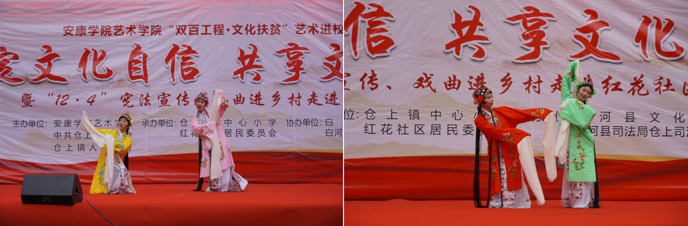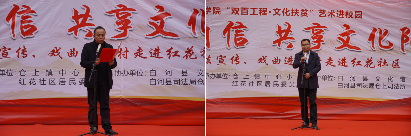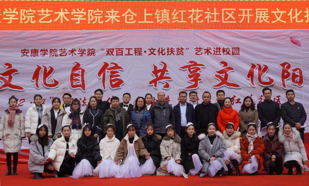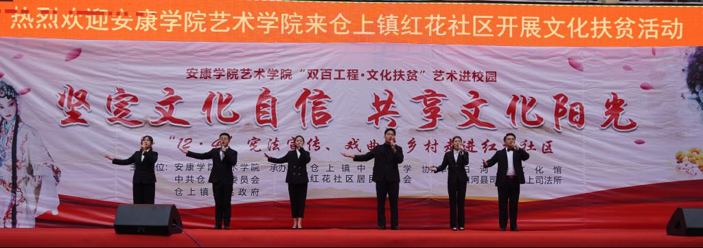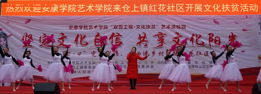 近日,我校艺术学院组织50余名师生赴白河县仓上镇开展“双百工程 文化扶贫”文化帮扶活动,为当地群众送去一台以“艺术进校园——坚定文化自信、共享文化阳光”为主题的精彩文艺演出。学校统战部副部长、扶贫办副主任张富华,艺术学院副院长成党伟、鲍丽,仓上镇镇长文永超、副镇长李玖国以及1000余名学生和社区群众参加了此次活动。