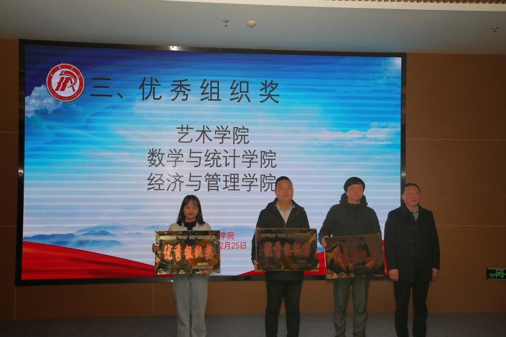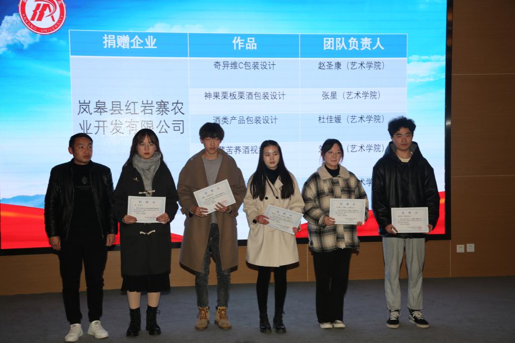 颁奖典礼上,体育学院张一凡《歌风春燕茶叶》、艺术学院金杉虹《吃货联盟-志根豆干包装设计》获得创新创意赛道包装设计类一等奖,艺术学院徐一峰《白河木瓜酒巴山-视频广告》获得创新创意赛道视频广告类一等奖,数统学院彭嘉伟《山中藏美酒,腊肉忆乡愁》获得创业实践赛道一等奖,艺术学院、数统学院、经管学院获得优秀组织奖。与会嘉宾向各获奖团队颁发证书。同时,我校向帮扶企业捐赠了15件优秀设计作品,充分体现了我校当代青年的责任与担当,展现了我校服务“三农”、服务区域经济社会发展的办学方向。