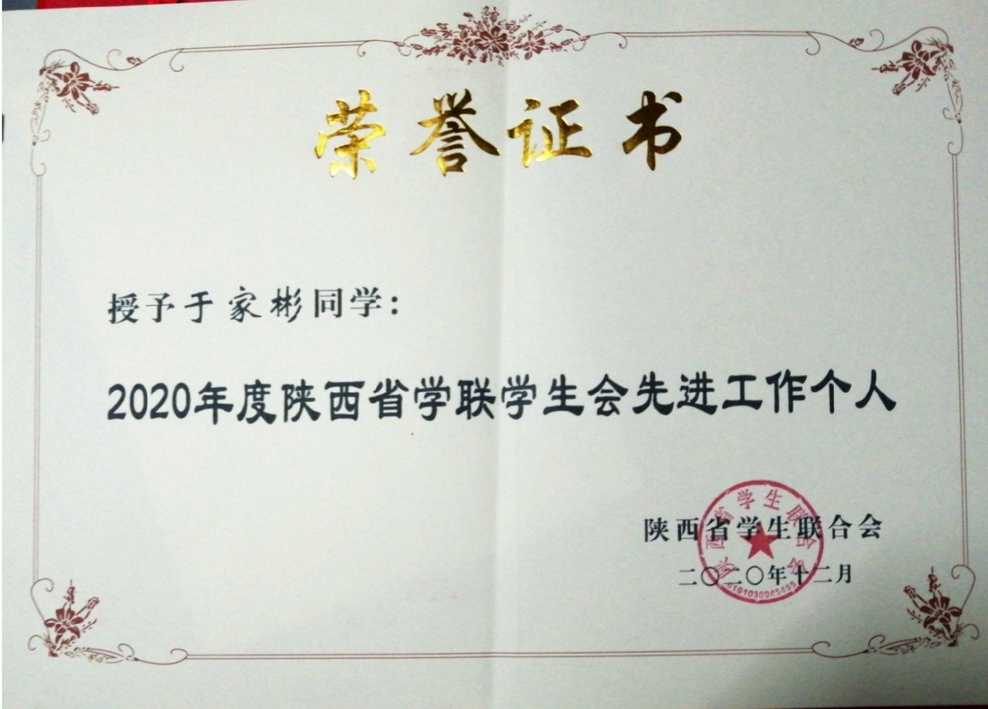 近日,陕西省学生联合会第十届委员会第四次全体会议在西安召开。大会通过《关于落实陕西省学生联合会对陕西各级学联学生会组织指导管理的若干规定》《陕西省学生联合会考核、奖励、责任追究制度》,选举产生了陕西省学生联合会第十届第四任主席,表彰了2020年度陕西省标兵学联学生会组织和陕西省学联学生会先进工作个人。我校第三十七届学生会主席团成员、文学与传媒学院学生分会主席团成员于家彬同学荣获陕西省学联学生会先进工作个人。
