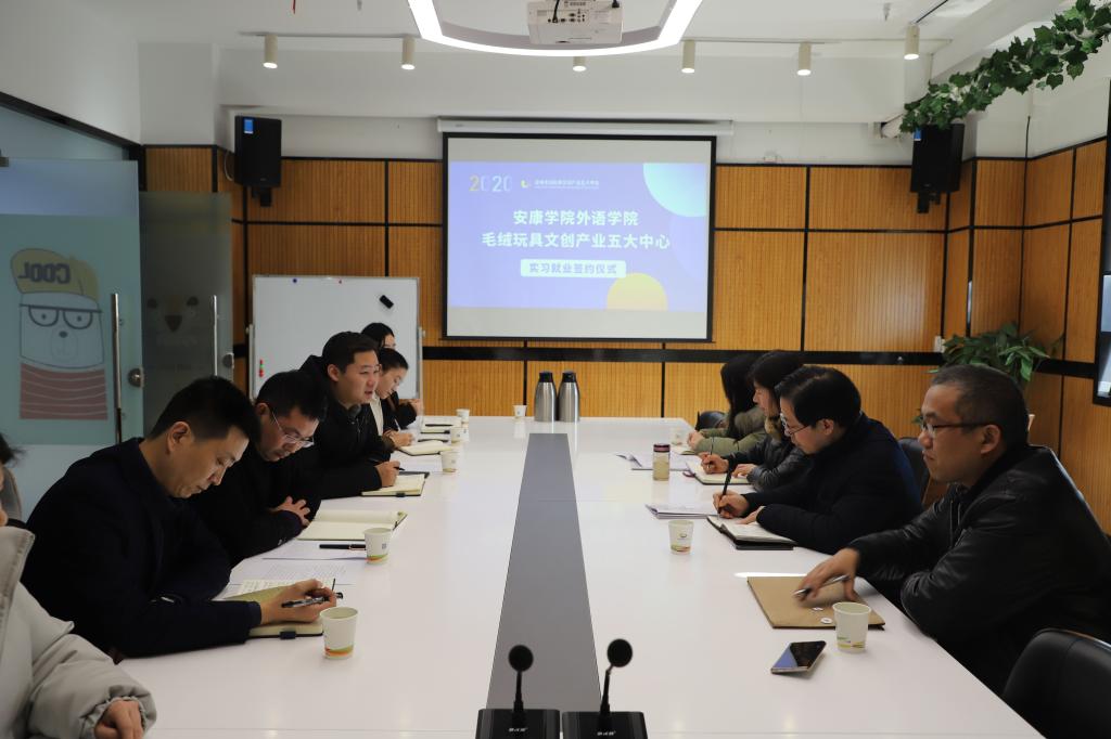 恒口示范区毛绒玩具领导小组办公室主任李伟、五大中心运营商(安康秦巴漫创玩具产业运营管理有限公司)负责人刘愚、外语学院副院长张哲华、胡卫卫、相关教师及部分实习生参加了签约仪式。