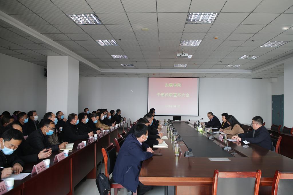 2月3日上午,我校在江北校区逸夫科技楼会议室召开干部大会,宣布丁巨涛同志为安康学院新任党委书记,王国良同志不再担任学校党委书记。陕西省委教育工委副书记陈乃霞,省委组织部宣教干部处处长张清,省委教育工委组织部部长郭强出席会议;学校校级领导、党委委员,职能部门主要负责人、二级学院党政负责人参加了大会。会议由丁巨涛主持。