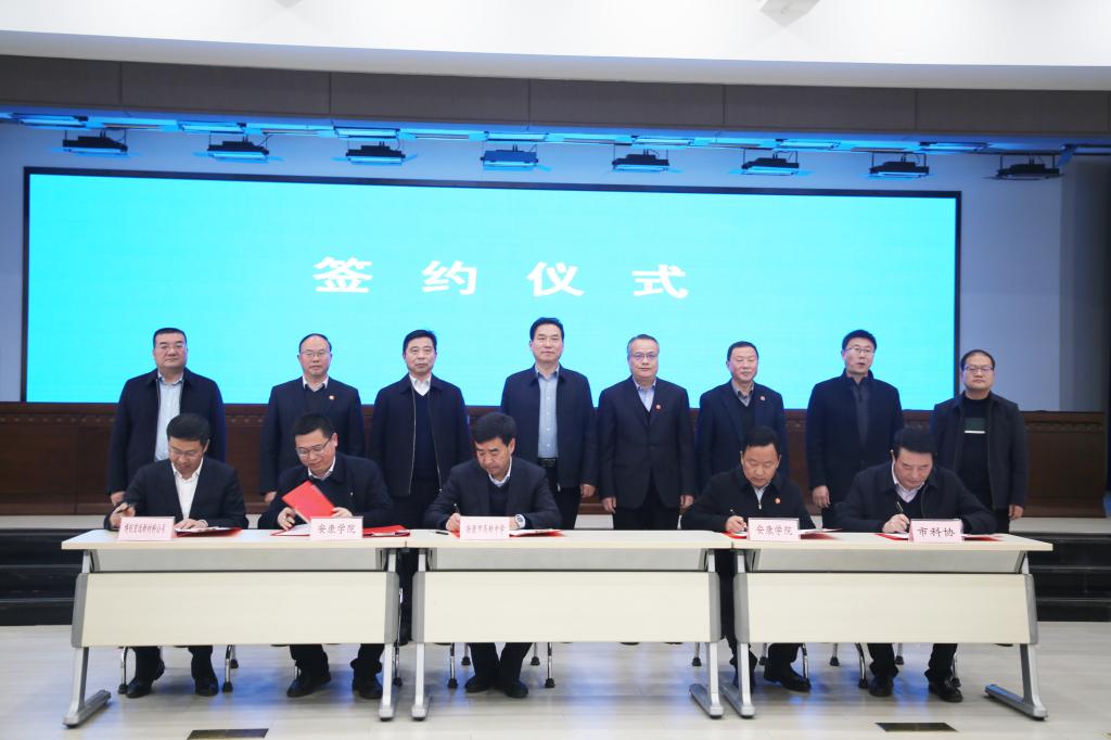 钟生海、余谦分别代表学校与市科协、安康高新中学及博创宏远新材料公司签订校地合作协议。
