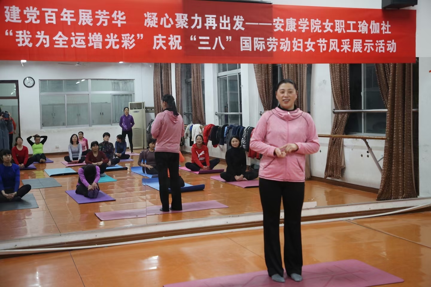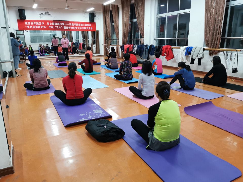 为丰富女职工精神文化生活,促进女职工全面发展,迎接第十四届全运会,在第111个“三八”国际劳动妇女节即将来临之际,我校女职工瑜伽社开展了庆“三八”健身展示活动,校工会兼职副主席、女工委主任肖红香,工会办公室主任胡敏,女工委委员马玉琴,以及20余名女职工共同参加了本次活动。
