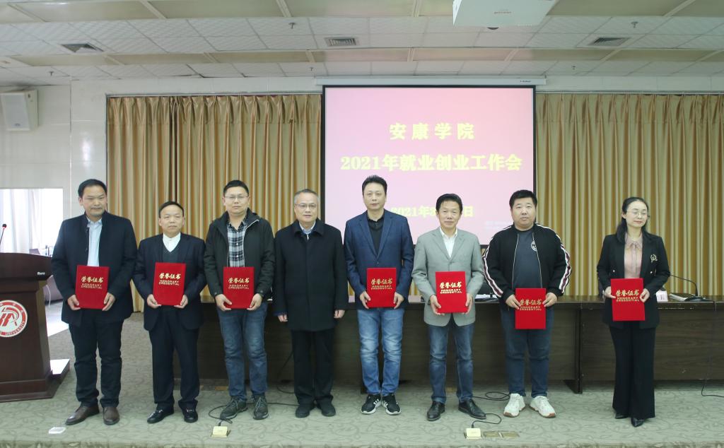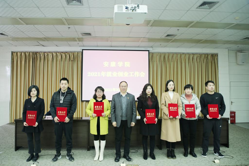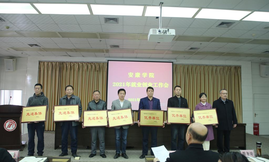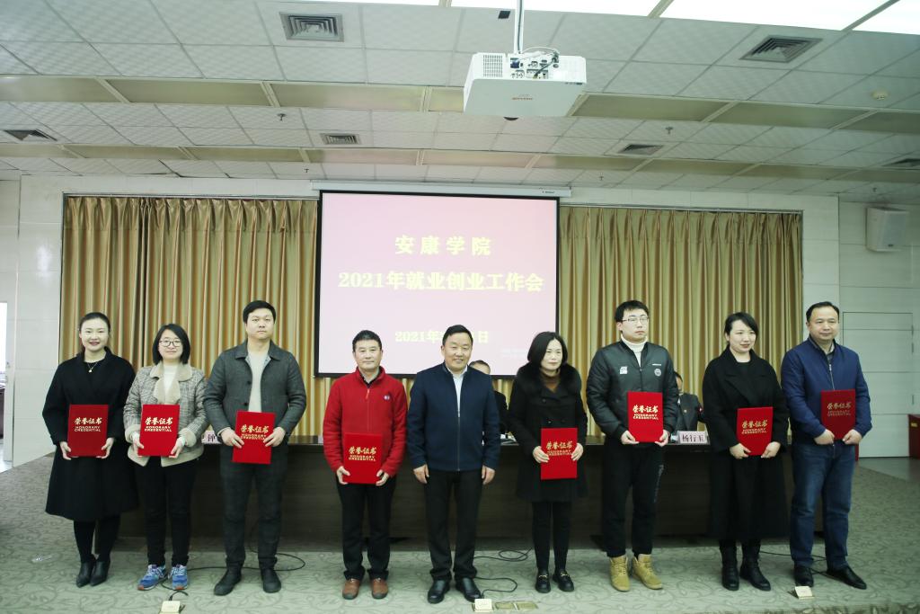 招就处处长丁义国宣读了《安康学院关于表彰2020年度就业创业工作先进集体、先进个人的决定》。学校领导为受表彰的先进集体和个人代表颁发了荣誉证书。文传学院院长杨运庚、旅环学院党总支书记张立虎、化工学院学工办主任王瑜、农生学院教师陈芳分别做了经验交流发言。