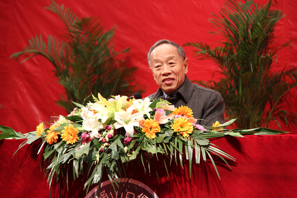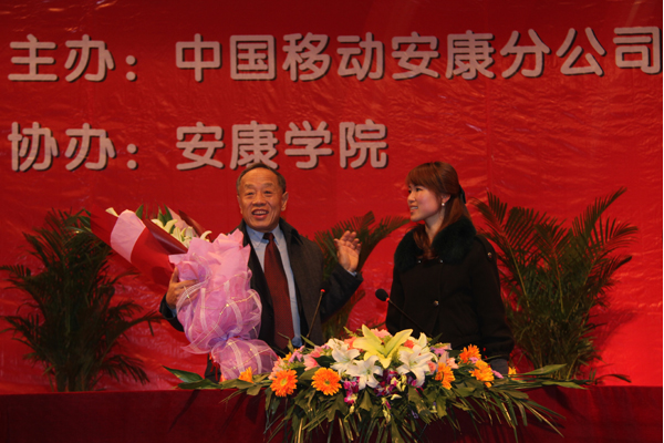 报告会结束时,李肇星将观众敬送的鲜花转赠给我院,并热情讲到“世界上再也没有哪个学校的名字是如此吉祥,有安有康。我愿意做安康学院的学生。”
