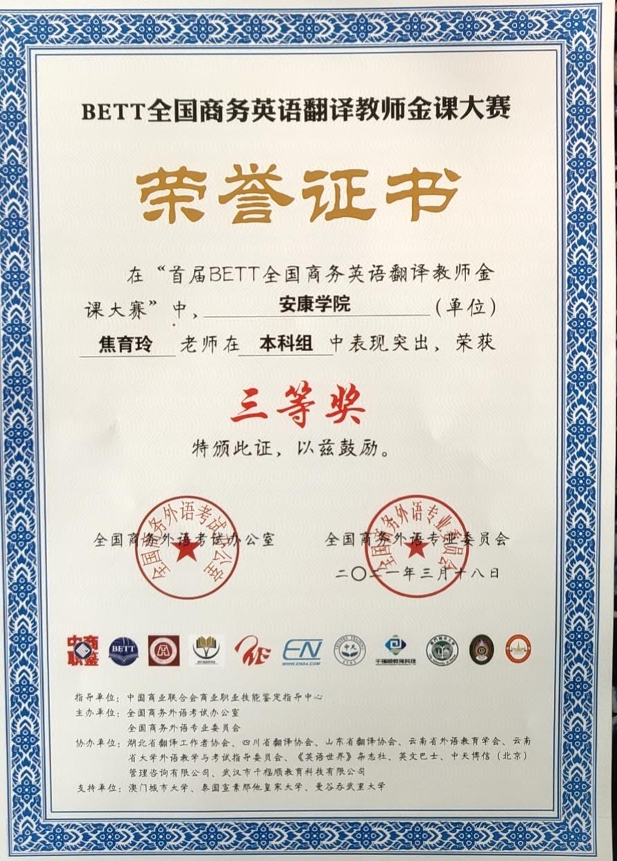 近日,历时四个多月的首届全国商务英语翻译教师金课大赛评选结果揭晓,23个省(直辖市)112所高校169位老师参加了比赛。我校外语学院教师焦育玲的作品《旅游景点名称的英译》获本科组三等奖。