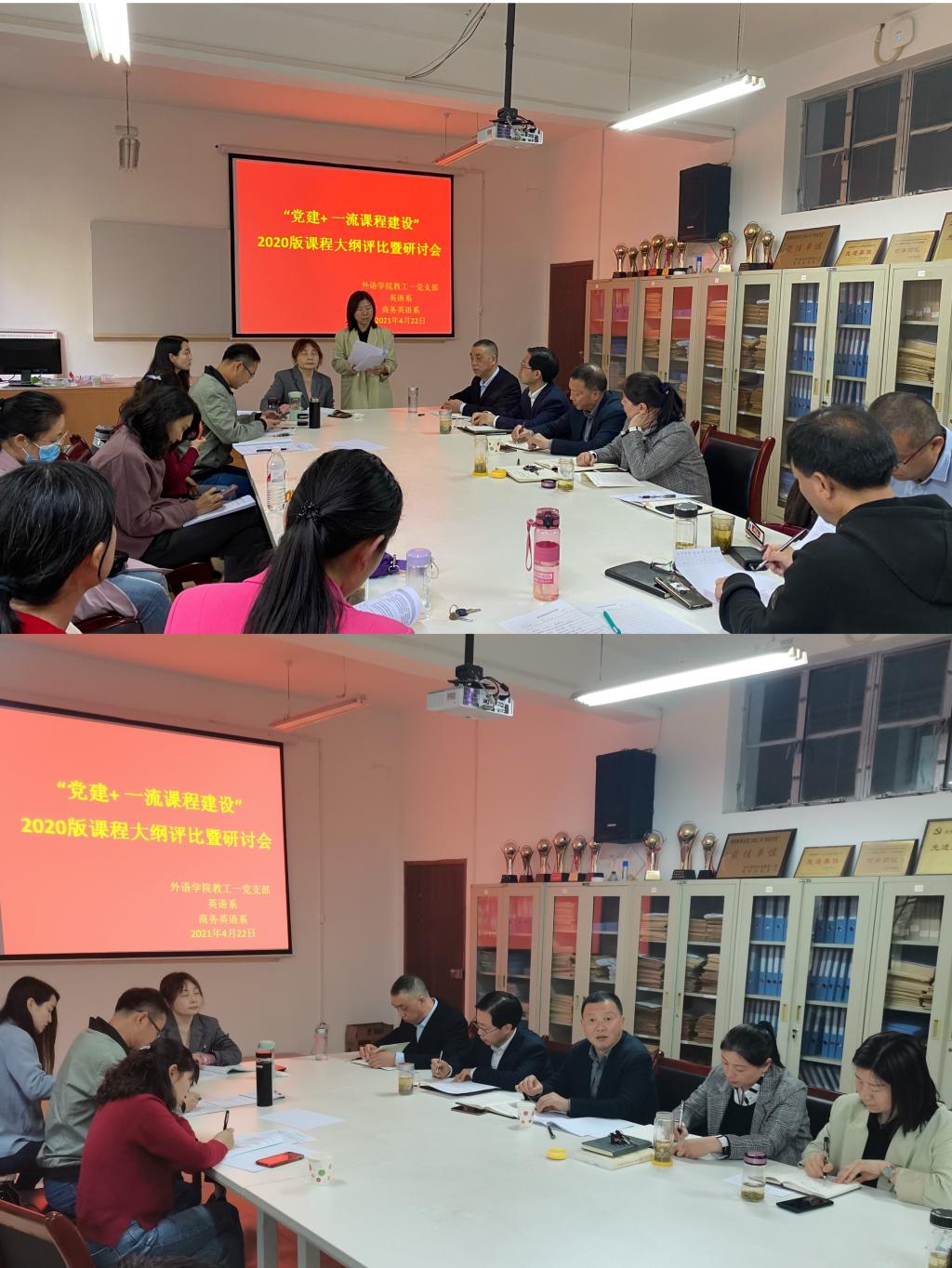4月22日下午,外语学院教工一支部召开“党建+一流课程建设”2020版课程大纲评比暨研讨会。外语学院班子成员、教学督导、教工一党支部全体党员、英语系、商务英语系全体党员和教师参加了本次活动。学校党委副书记胡波以普通党员身份参加了本次活动。
