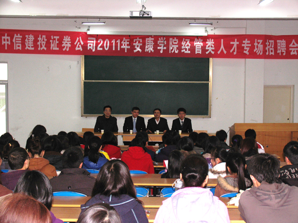 中信建投股份有限公司是中国证监会批准设立的全国性大型综合证券公司,是我国目前为数不多的A类AA级“全牌照”证券公司,在全国20多个省份80多个大中城市设有近130家营业部,安康营业部是中信建投证券公司在陕西的第二家营业部,该营业部已筹建完毕即将开业,本次计划在我院招聘、培养15名理财规划师、客服代表。就业处获得这一消息后,积极与经管系联系组织专场招聘会,为学生就业发展搭建了一个很好的选择平台。