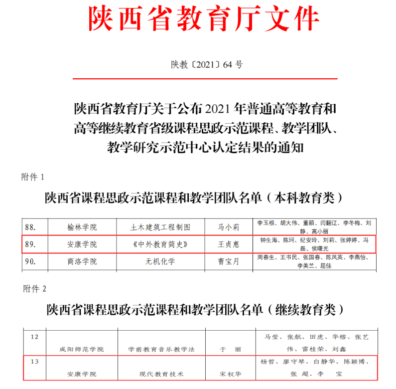 4月28日,陕西省教育厅公布了《2021年普通高等教育和高等继续教育省级课程思政示范课程、教学团队、教学研究示范中心认定结果的通知》,我校王贞惠副教授负责的《中外教育简史》和宋权华副教授负责的《现代教育技术》分别被认定为陕西省本科教育类课程思政示范课程和继续教育类课程思政示范课程,其教学团队被认定为省级课程思政示范教学团队。