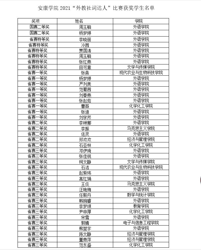 近日,2021年“外教社·词达人杯”大学生英语词汇大赛全国决赛和陕西省赛成绩揭晓。我校学生周玉毓、杨梦婷获得国赛二等奖;李晓丽等6名学生获得省赛特等奖,张犇等9名学生获得省赛一等奖,李琳娜等5名学生获得省赛二等奖,邓伊琦等18名学生获得省赛三等奖。