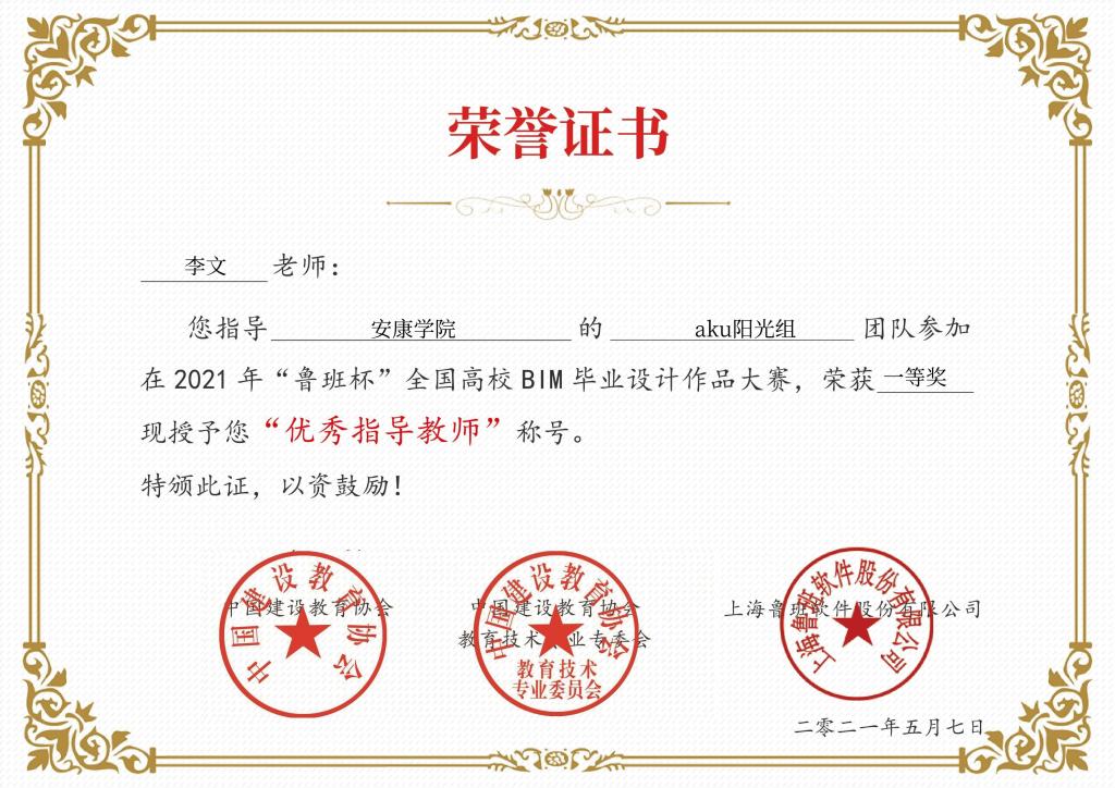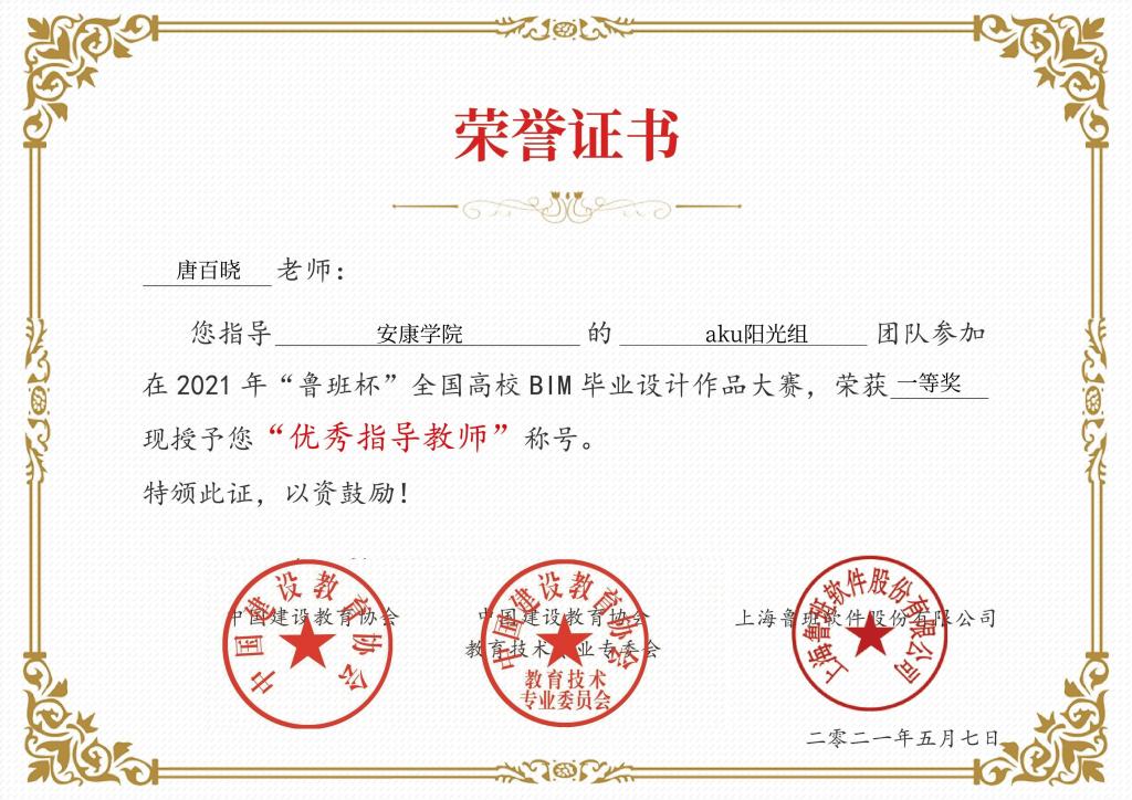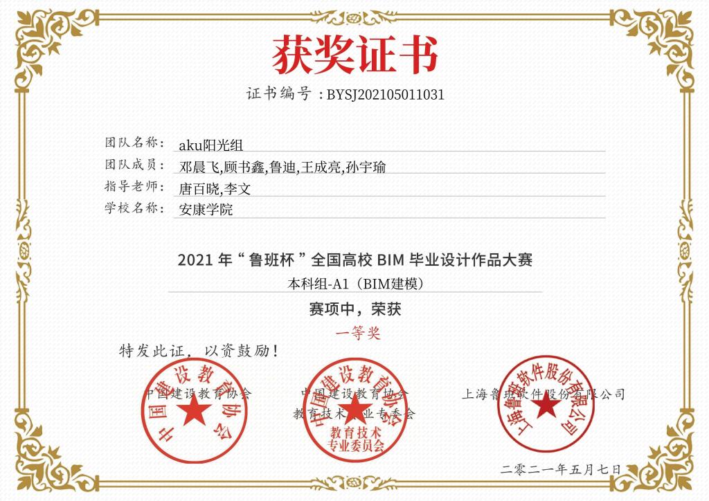 该项赛事由中国建设教育协会主办、中国建设教育协会教育技术专业委员会、重庆交通大学与上海城建职业学院共同承办、上海鲁班软件股份有限公司协办,历时近6个月。比赛共分为2个组别7个赛项,共有896支团队5600余名师生参加了本次比赛。我校经管学院教师唐百晓、李文指导学生团队“aku阳光组”经过初赛、决赛、线上答辩和专家评审等环节在房建组BIM建模赛项中获得全国一等奖,指导教师获得“优秀指导老师”称号。