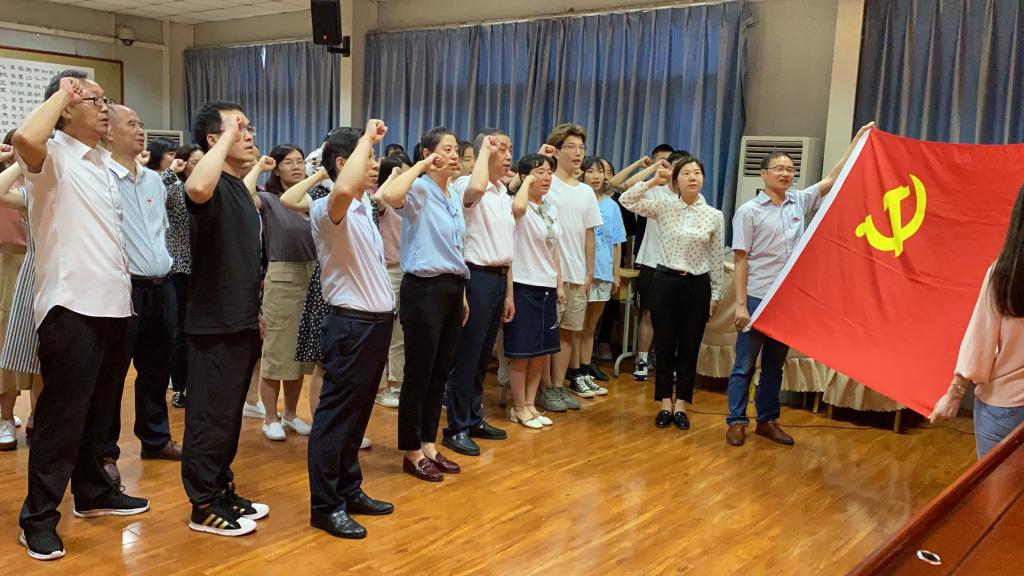 党总支副书记胡卫卫领誓,全体党员重温入党誓词,再表初心,牢记使命;肖红香代表院党总支总结了党史学习教育以来取得的阶段性成果,号召全体党员在办好人民满意的教育的生动实践中“亮身份、做表率”,学好百年党史,凝聚奋进之心。