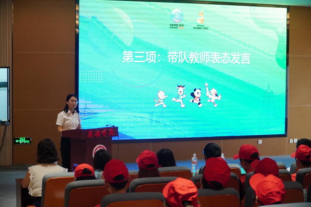 誓师动员大会在庄严的国歌声中拉开帷幕,我校学生志愿者张玥、带队教师代表付路静代表全体志愿者郑重承诺:将秉承“奉献,友爱,互助,进步”的志愿者精神,严格要求自己,遵守服务守则,牢记行为规范,发扬务实,求实的工作作风,以一流的服务质量和饱满的精神状态,为十四运会马拉松游泳项目圆满成功,贡献出自已的青春力量!