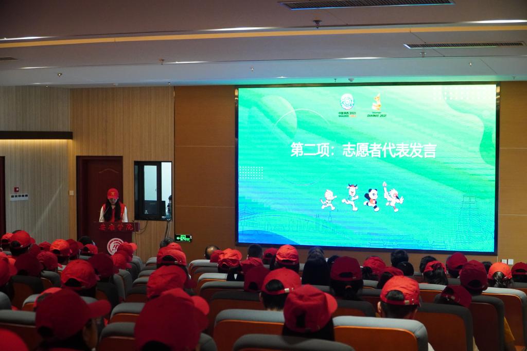胡波做动员讲话。他首先充分肯定了我校志愿者在5月份“武术散打项目测试赛暨陕西省青少年邀请赛”中出色的工作表现,他强调,全运会首次来到陕西,走进安康,这是三秦儿女和安康人民的骄傲,作为安康学院的青年学子们一定要强化东道主意识,发挥特长,主动担当,用实际行动阐释“笃学 尚行 砺志 创新”的校训,展现出安大学子的良好风貌,用智慧和汗水为十四运会添彩。他要求,全体志愿者要进一步提高认识,增强志愿服务的责任感和使命感;要全力做好冲刺阶段志愿服务保障工作,积极投身赛前培训,着力提高志愿服务水平;相关单位要统筹安排,增强责任意识,切实保障赛会志愿服务工作。