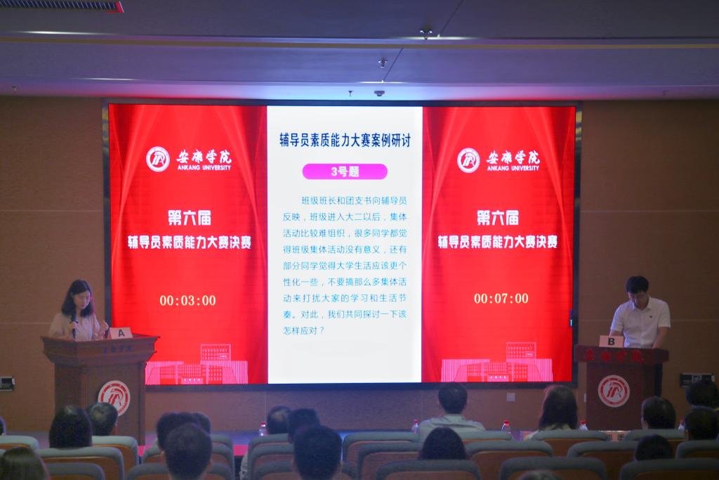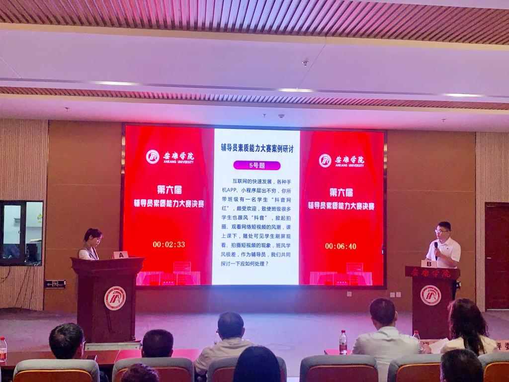 辅导员素质能力大赛分为初赛与决赛两个部分,初赛采用基础知识测试,并经二级学院推荐及案例分析测评等环节,从我校42名辅导员中遴选6名辅导员进入决赛。决赛包括案例研讨和谈心谈话两个环节。参赛辅导员以较强的专业水准生动演绎了辅导员在平凡岗位上不平凡的工作状态,彰显了我校辅导员队伍的建设水平和整体素质。