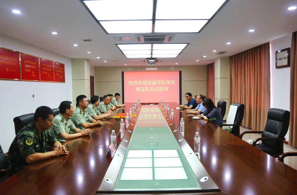 7月28日上午,在“八一”建军节即将到来之际,我校党委副书记杨行玉一行前往武警安康支队驻地开展“八一”建军节慰问活动,武警安康支队党委书记、政治委员杜涛,党委副书记、支队长訾进前等领导热情接待并参加了座谈会。