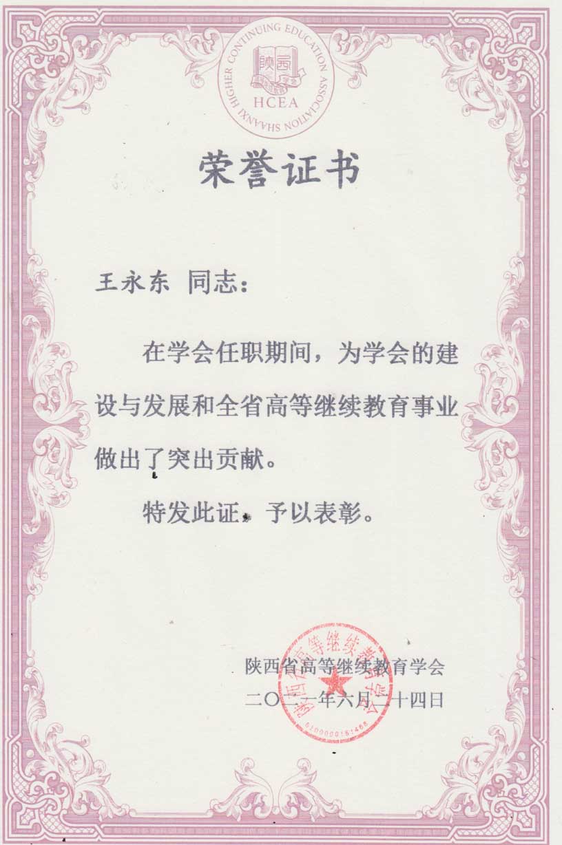 近日,陕西省高等继续教育学会为推动陕西省高等继续教育学会建设和陕西省高等继续教育改革发展,对学会成立以来曾担任学会理事以上职务的管理工作者和相关专家进行表彰,我校原继续教育学院院长王永东同志获得突出贡献奖。