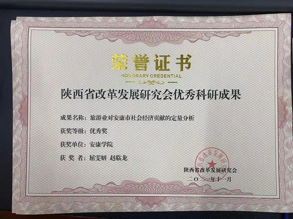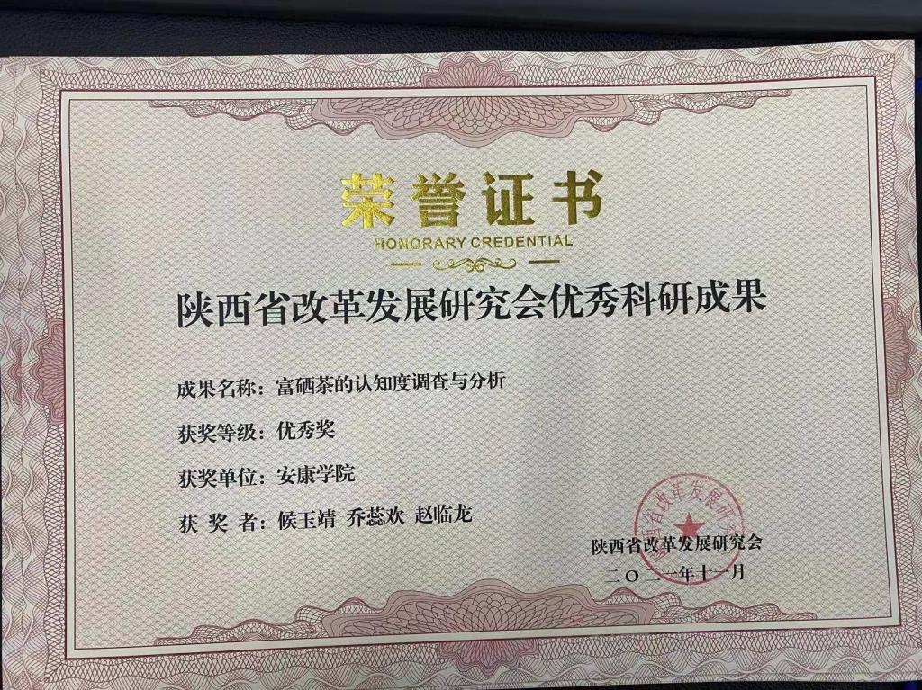大会对陕西省改革发展研究会庆祝建党100周年优秀科研成果进行表彰,其中我校赵临龙教授论文《“自然国心——鸡心岭”旅游文化品牌的深度开发研究》获得特等奖,我校2021届数统学院统计学专业学生候玉靖、乔蕊欢在校期间本科论文《富硒茶的认知度调查与分析》,2017届数统学院学统计学专业生屈雯妍在校期间本科论文《旅游业对安康市社会经济贡献的定量分析》,2021届数统学院统计学专业学生张柏馨、王选程在校期间本科论文《安康富硒茶消费特征及意愿调查》获得优秀奖。