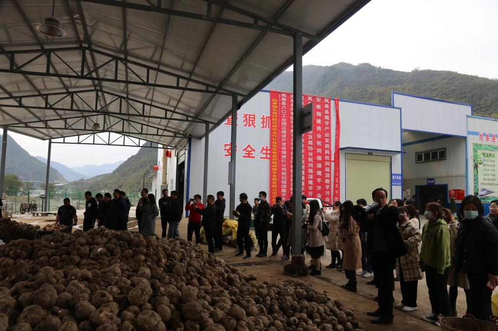 立冬已过,天气阴冷,但岚皋县六口工业园区润福源魔芋发展有限公司魔芋精粉加工厂却热闹非凡。“刚刚我们在地里观看了珠芽黄魔芋的挖收。现在这是花魔芋,是岚皋魔芋的主要产量。”岚皋县产业发展局局长刘列平一手指着眼前堆放如山的花魔芋,一手拿着大喇叭正在给围观的学员们讲解魔芋生产流程。