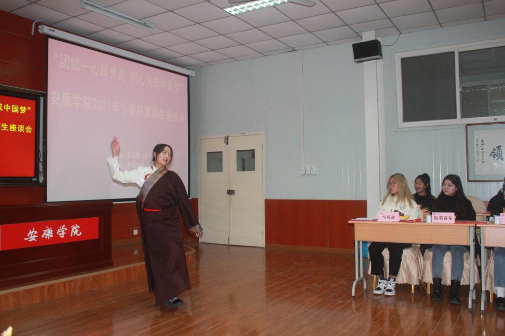 为认真学习贯彻习近平新时代中国特色社会主义思想,深化党史学习教育,加强和促进民族团结进步宣传教育工作,11月18日下午,由学工部主办,外语学院承办的以“团结一心跟党走,同心共筑中国梦”为主题的少数民族师生座谈会在江南校区1018室如期召开。校党委副书记杨行玉出席座谈会并讲话。学工部部长李岩,校党委统战部副部长张富华,校团委副书记张慧,全校各二级学院11个少数民族的27名师生代表参加了座谈会。活动由外语学院党总支书记肖红香主持。