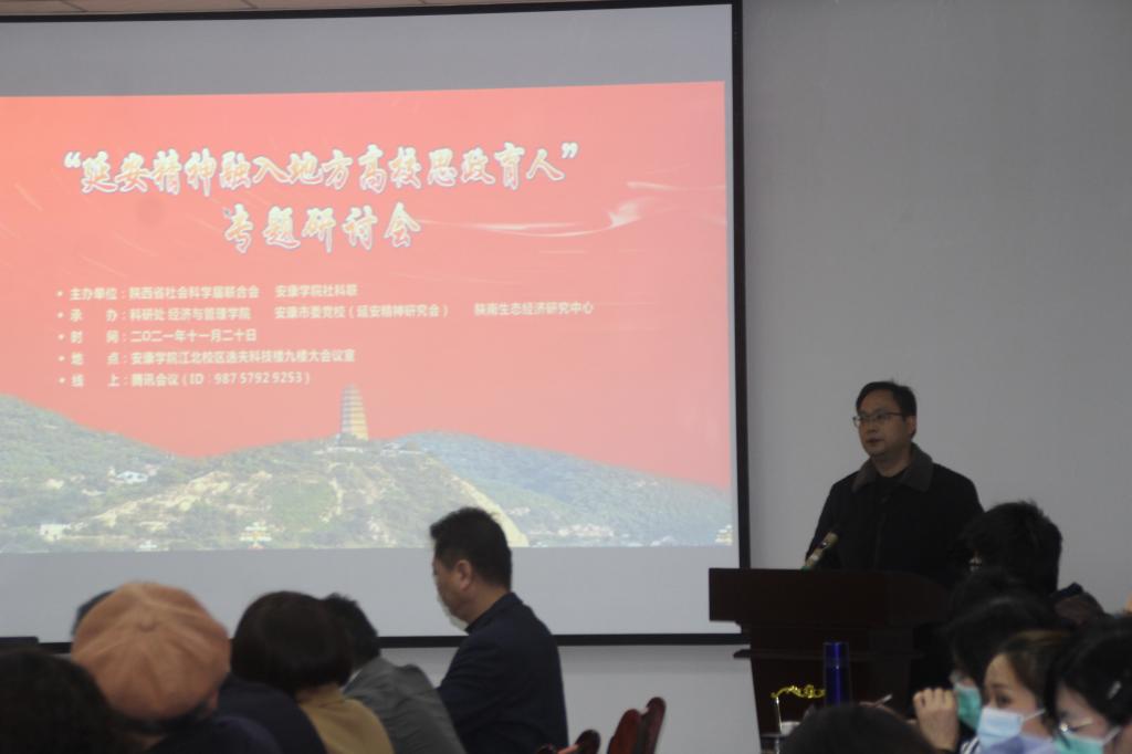11月20日,由陕西省社科联和安康学院社科联主办,安康学院科研处、经管学院、安康市委党校(延安精神研究会)、陕南生态经济研究中心共同承办的陕西省社科界第十五届(2021)学术年会分场活动——“延安精神融入地方高校思政育人”专题研讨会在安康学院江北校区逸夫科技楼九楼会议室顺利召开。来自陕西省社科联、安康市党史研究室、安康市延安精神研究会、延安大学及安康学院师生代表共80余人参加了本次研讨会。陕西省社科联党组成员、秘书长苗锐军和安康学院党委委员、宣传部部长鲁延安分别致辞。会议由经管学院院长、陕南生态经济研究中心主任李勇主持。