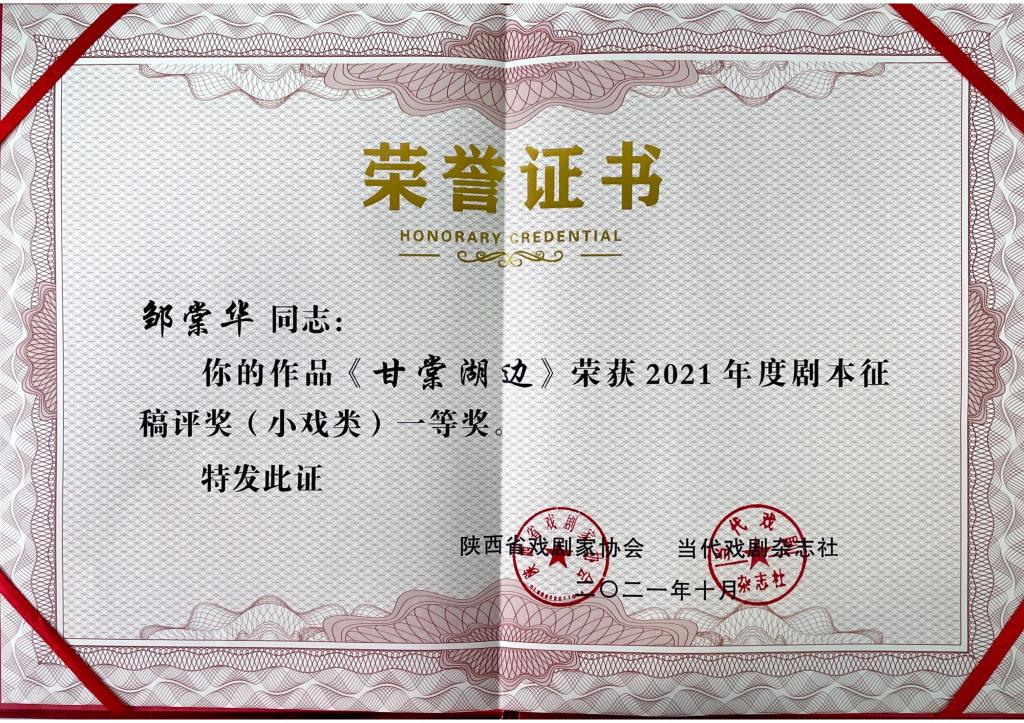 在陕西省戏剧家协会、当代戏剧杂志社联合举办的2021年剧本征稿活动中,我校文学与传媒学院教师邹棠华精心创作的小戏《甘棠湖边》荣获剧本征稿小戏类作品一等奖。