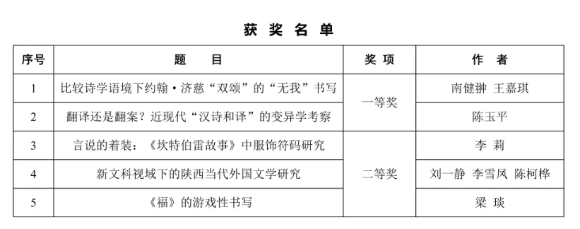 12月11日,陕西省社科界第十五届(2021)学术年会主场活动在西安外国语大学雁塔校区顺利举办。我校学报2020年第4期刊发的陈玉平博士论文《翻译还是翻案?近现代“汉诗和译”的变异学考察》作为陕西省外国文学研究会推荐的5篇论文之一,参加年会优秀论文评选并获一等奖。